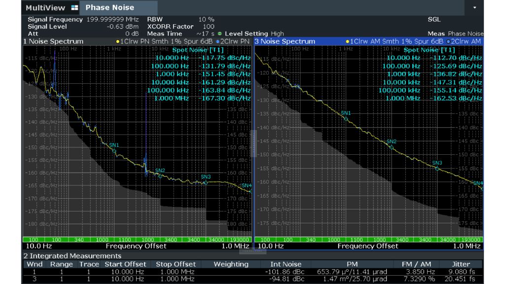 R&S FSWP предлагает новый подход, который позволяет одновременно измерять амплитудные и фазовые шумы при смещении частоты до 30 МГц. Оба результата одновременно отображаются в одном или в отдельных окнах.
