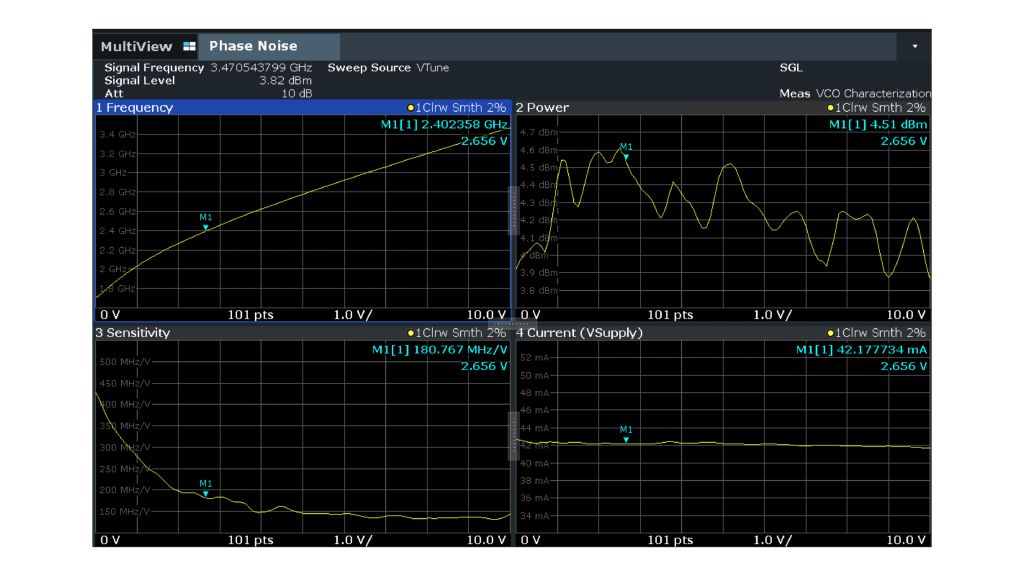 Благодаря сверхмалошумящим внутренним источникам постоянного тока анализатор R&S FSPN может измерять фазовый шум генераторов, управляемых напряжением (ГУН), при различном управляющем напряжении и напряжении питания. Определение характеристик ГУН путем изменения управляющего напряжения или напряжения питания может выполняться очень быстро. Следующие параметры определяются мгновенно: