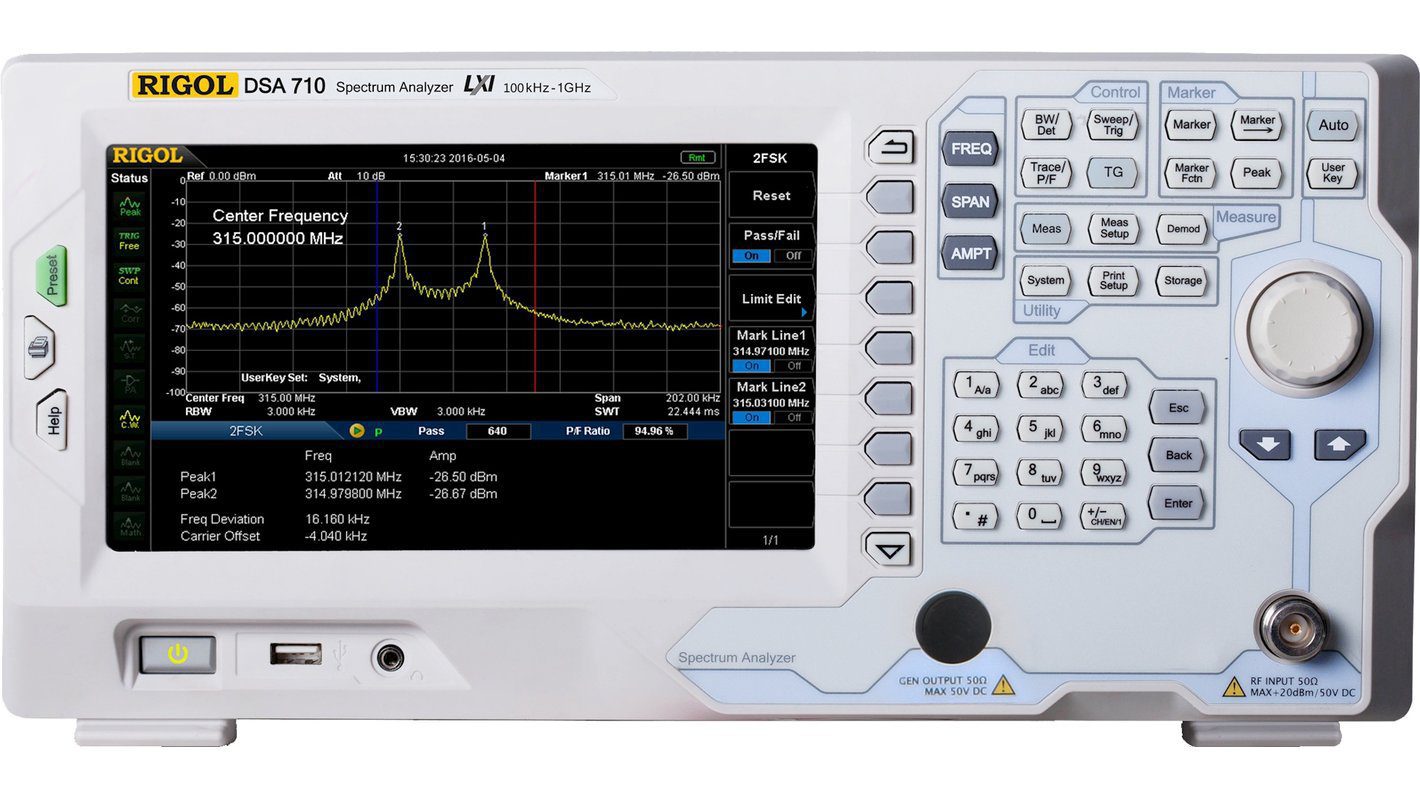 DSA705 — анализатор спектра реального времени с диапазоном частот 100 кГц — 500 МГц и полосой пропускания 100 Гц — 1 МГц. Это недорогой, производительный прибор лабораторного класса. Имеет настольный формат (компактные размеры и вес всего 4,25 кг), удобные органы управления на передней панели и 8-дюймовый экран. Данный анализатор позволяет удобно и быстро проводить измерения благодаря низкому уровню фазовых шумов, широкой полосе анализа и функционалу анализатора спектра общего назначения, а также опционального измерителя электромагнитных помех.В арсенале прибора заложена интересная опция SSС-DSA (Signal Seamless Capture) – непрерывный захват сигналов в полосе до 1,5 МГц при скорости измерения до 650 спектров в секунду. Использование этого режима удобно при захвате быстроменяющихся сигналов, ASK / FSK, чтобы предотвратить пропуск события. Подойдет для разработки, производства и измерений электронных компонентов и устройств в лабораторных, а также в сервисных и учебных целях, благодаря своей невысокой стоимости.
