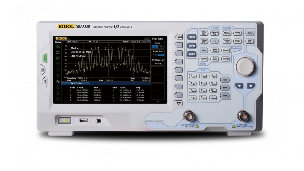 DSA832E-TG — настольный анализатор спектра лабораторного класса с встроенным трекинг-генератором. Диапазон частот от 9 кГц до 3.2 ГГц при полосе пропускания 10 Гц – 1 МГц. Анализатор выполнен в моноблочном корпусе (вес 5,15 кг) и имеет 8-дюймовый экран. Технические возможности прибора позволяют эффективно различать соседние сигналы одинаковой амплитуды и улучшать распознавание сигналов. Низкий уровень собственных шумов (до -161 дБм) гарантирует возможность эффективного измерения слабых сигналов. При использовании моста VSWR (КСВН) возможно измерение коэффициента стоячей волны по напряжению VSWR (КСВН) и многое другое. Таким образом, данный анализатор позволяет удобно и быстро проводить измерения благодаря низкому уровню фазовых шумов, широкой полосе анализа и функционалу таких приборов, как: