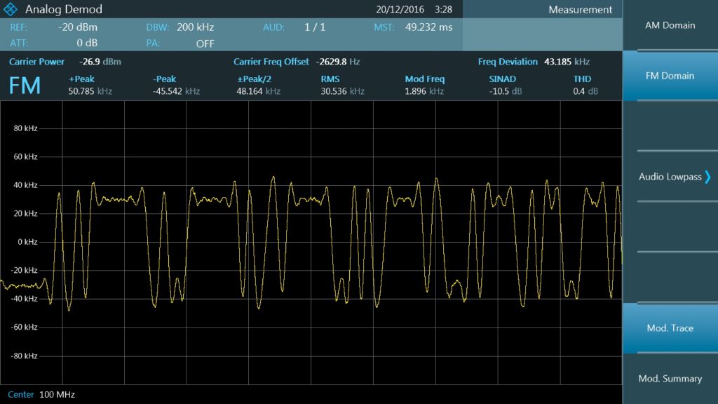 Базовые форматы цифровой модуляции используются при решении множества задач, например, в связи ближнего поля. R&S FPC поддерживает анализ АМн и ЧМн. На экранах цифровой модуляции отображаются кривая, глазковая диаграмма, ошибки модуляции и результаты символьного анализа. Также доступны специализированные конфигурационные предварительные настройки для Bluetooth Low Energy (Bluetooth LE) и систем мониторинга давления в шинах (TPMS). Демодулированный звук поддерживается с помощью как встроенного динамика, так и гнезда для подключения наушников.