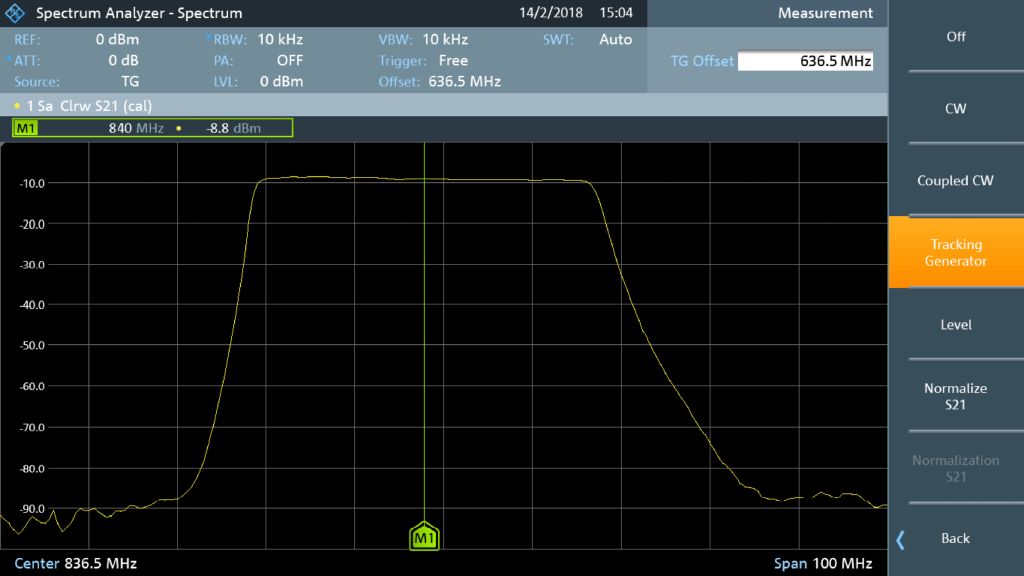 В радиотехнике часто требуются испытания пассивных или активных ВЧ-цепей, которые не генерируют независимые ВЧ-сигналы (например, усилители, фильтры или ВЧ-кабели). В этом случае недостаточно наличия автономного анализатора спектра и требуется генератор сигналов. R&S FPC1500 оснащен функцией следящего генератора, которая позволяет проводить измерения характеристик передачи в ВЧ-фильтре и общие измерения АЧХ.