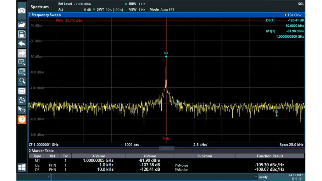 По основным характеристикам — фазовый шум –108 дБн/Гц (тип.) при отстройке 10 кГц (от несущей 1 ГГц), точка пересечения третьего порядка +20 дБмВт (тип.), полоса разрешения от 1 Гц до 10 МГц и средний уровень собственного шума –163 дБмВт (тип.) — прибор R&S FPL1000 может сравниться с анализаторами более высокого класса. Идеально подходит для лаборатории, производства или техобслуживания.