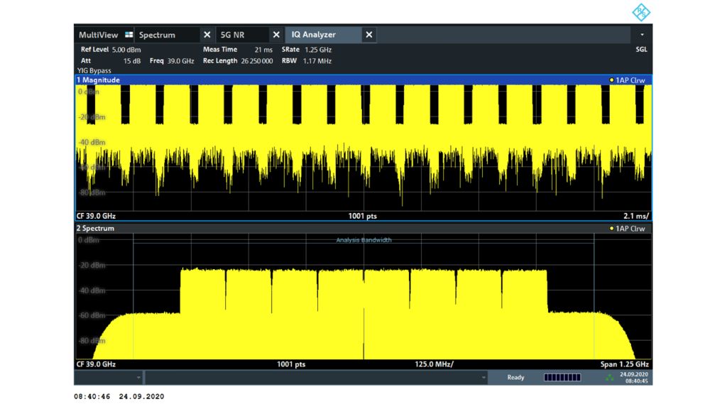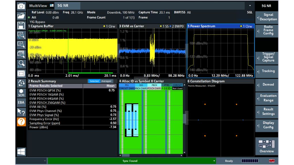 Анализатор сигналов и спектра R&S FSVA3000 идеально подходит для анализа сигналов беспроводной связи на этапах НИОКР, системных испытаний, верификации и производства. Благодаря полосе анализа 400 МГц возможен одновременный захват четырех соседних несущих 5G NR. Специализированные опции для анализа сигналов 5G NR обеспечивают модуль вектора ошибок с погрешностью менее 1% для несущей шириной 100 МГц при 28 ГГц.