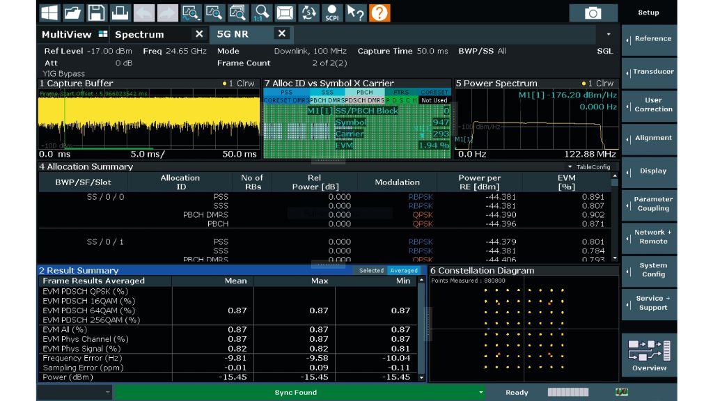 • Опции R&S FSW-K144 и R&S FSW-K145 охватывают внутриполосные измерения 3GPP 5G NR в нисходящем и восходящем каналах. Анализируется каждый подкадр сигнала, обеспечивается широкий диапазон результатов измерения, включая EVM, частоту и мощность различных каналов и сигналов.
