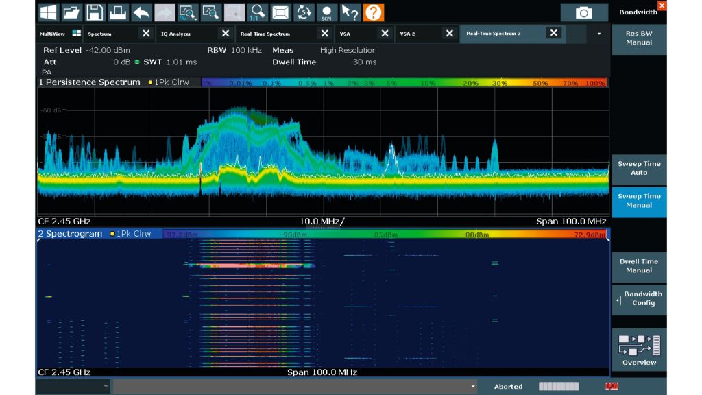 Опции R&S FSW реального масштаба времени позволяют пользователям стабильно обнаруживать исключительно кратковременные случайные помехи в наносекундном диапазоне даже в непосредственной близости от эффективных несущих в полосе пропускания до 800 МГц. Анализ спектра в реальном масштабе времени позволяет пользователям анализировать существующие алгоритмы скачкообразной перестройки частоты и создавать альтернативные варианты для предотвращения конфликтов между сигналами различных стандартов в одной полосе частот.