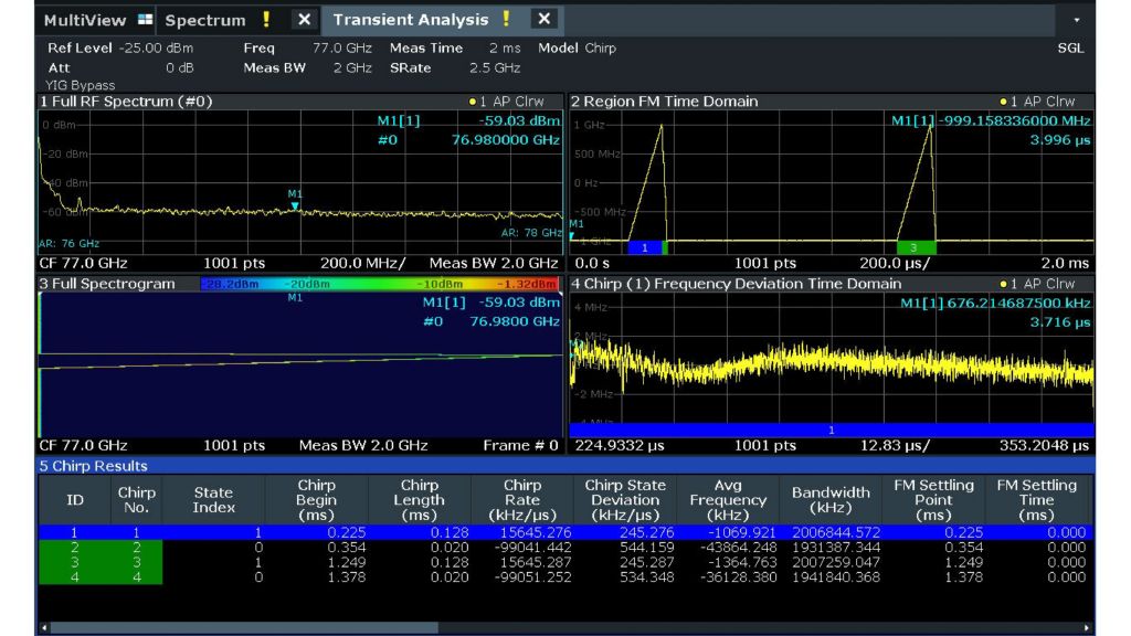 Анализатор спектра и сигналов R&S FSW85 имеет ЖИГ-преселектор для частот от 8 до 85 ГГц, обеспечивая возможность анализа спектра без изображений. Его широкая полоса анализа (до 8,3 ГГц) в сочетании с опцией анализа переходных процессов/ЛЧМ-сигналов R&S FSW-K60/-K60C позволяет определять характеристики сигналов FMCW шириной 5 ГГц подобно сигналам, используемым в автомобильных радарах.
