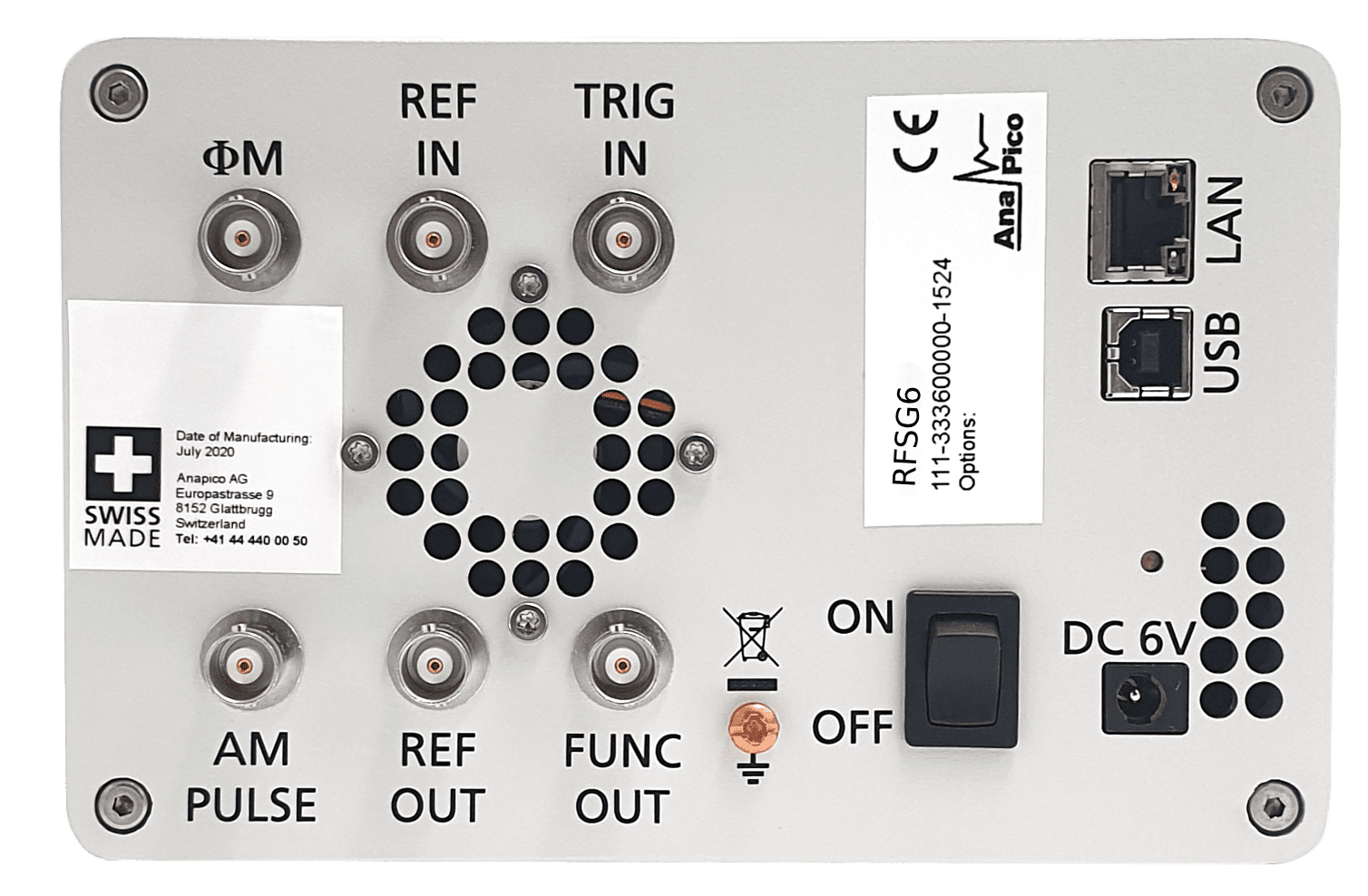 AnaPico RFSG6 — это портативный аналоговый генератор сигналов серии RFSGx с низким фазовым шумом и быстрым переключением частоты, с диапазоном частот от 9 кГц до 2 Гц.