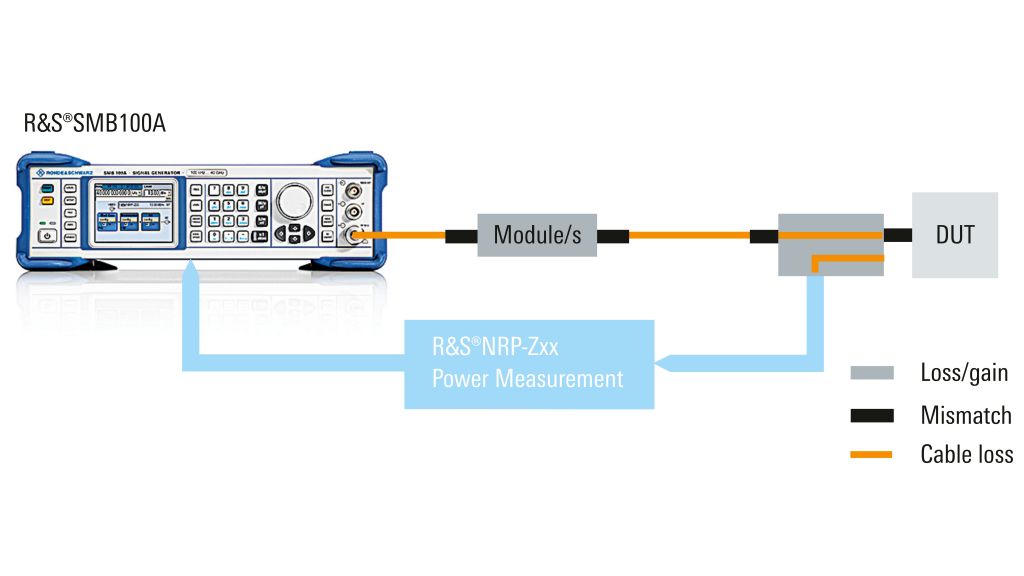 Направленный ответвитель и подключенный датчик мощности R&S NRP-Zxx можно использовать для измерения входной мощности ИУ. Неплохой альтернативой направленному ответвителю является датчик контроля уровня R&S NRP-Z28. Результаты измерений из R&S NRP-Zxx или R&S®NRP-Z28 передаются обратно в R&S SMB100A, который немедленно регулирует свою выходную мощность, чтобы компенсировать расхождение между требуемым и измеренным уровнями.