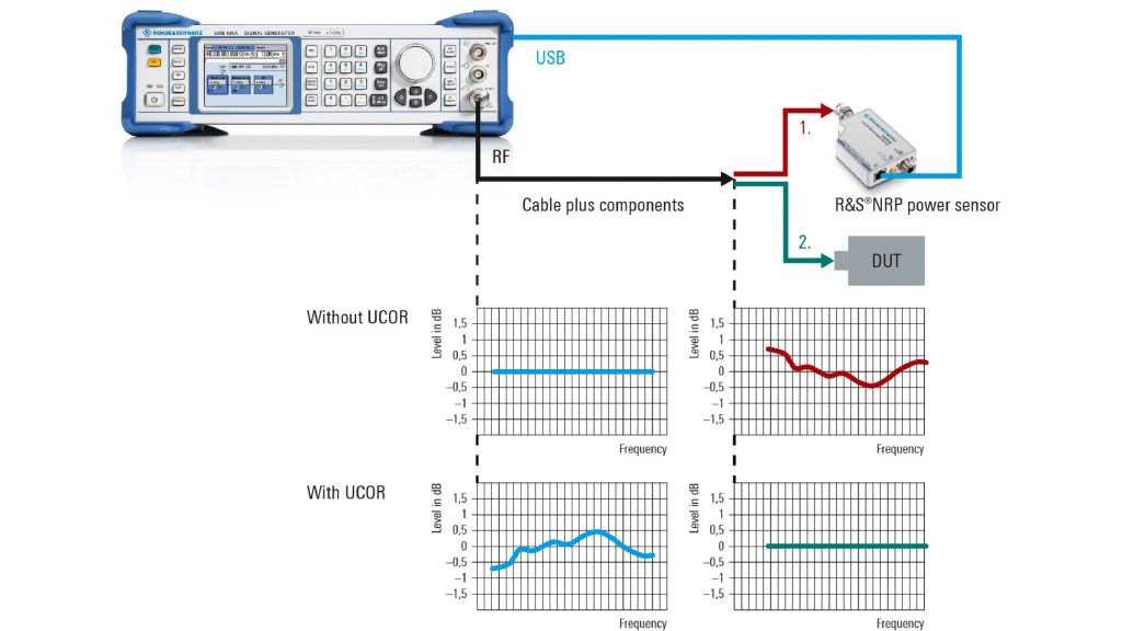 ИУ зачастую подключаются к генератору сигналов с помощью длинных кабелей или других частотно-зависимых компонентов, поэтому очень важно компенсировать эту зависимость от частоты. С этой целью R&S SMB100A обеспечивает выполнение функции пользовательской коррекции (UCOR). При использования датчика мощности R&S NRP значении UCOR автоматически определяются нажатием одной кнопки. В новой опорной плоскости для UCOR доступен ВЧ-сигнал с компенсацией АЧХ.