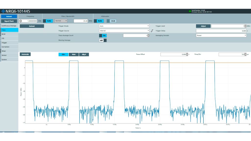 При тестировании компонентов нелинейные характеристики испытуемого устройства затрудняют установку требуемого уровня выходной мощности. Опция сервоуправления мощностью R&S NRQ6-K2 позволяет использовать выделенный последовательный канал связи через разъемы запуска между датчиком R&S NRQ6 и генератором R&S SGT100A. Требуемая мощность будет установлена за несколько итераций, что занимает обычно от 1 мс до 1,5 мс.