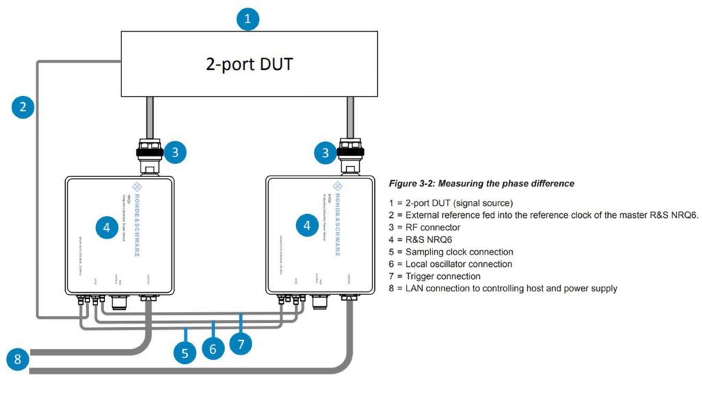 Синхронные фазокогерентные измерения (опция R&S NRQ6-K3) выполняются на основе соотношении ведущий/ведомый между несколькими приборами R&S NRQ6. Ведущий прибор передает сигнал гетеродина (LO) и его тактовый сигнал (CLK) на ведомое (ведомые) устройство и запускает его (их). Фазы ВЧ-сигналов можно измерять на 8 портах, при этом типичная погрешность составит всего 0,1 градуса при мощности -60 дБмВт.
