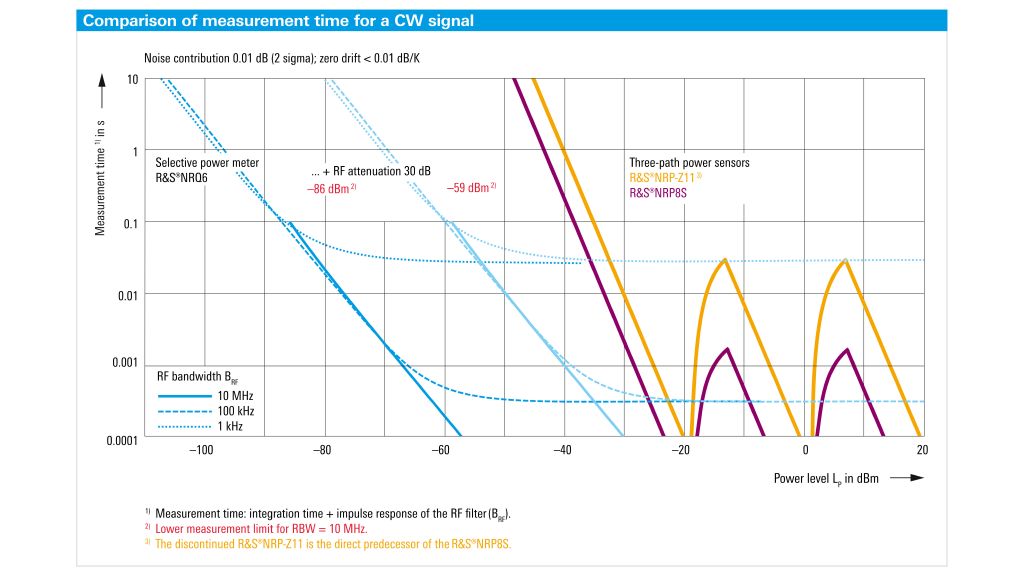 Любой диодный измеритель мощности работает без ограничения полосы частот в указанном диапазоне частот. Для точного измерения маломощных сигналов требуется усреднение нескольких измерительных отсчетов и увеличивает время измерения. Технология диодных измерителей мощности является хорошо отработанной, и поэтому инновации в ней возможны лишь в ограниченной степени. Прибор R&S NRQ6 на основе технологии приемника существенно увеличивает скорость измерения маломощных сигналов.