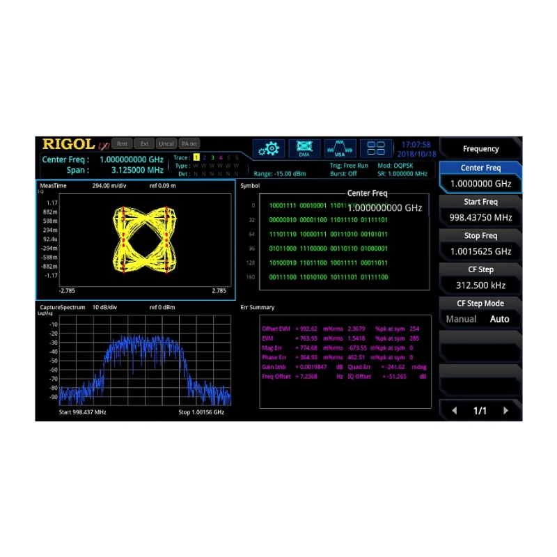 Программная опция RSA5000-VSA векторного анализа позволяет декодировать сложные сигналы (QAM, PSK, MSK, ASK, FSK и других) и проводить их комплексный анализ.