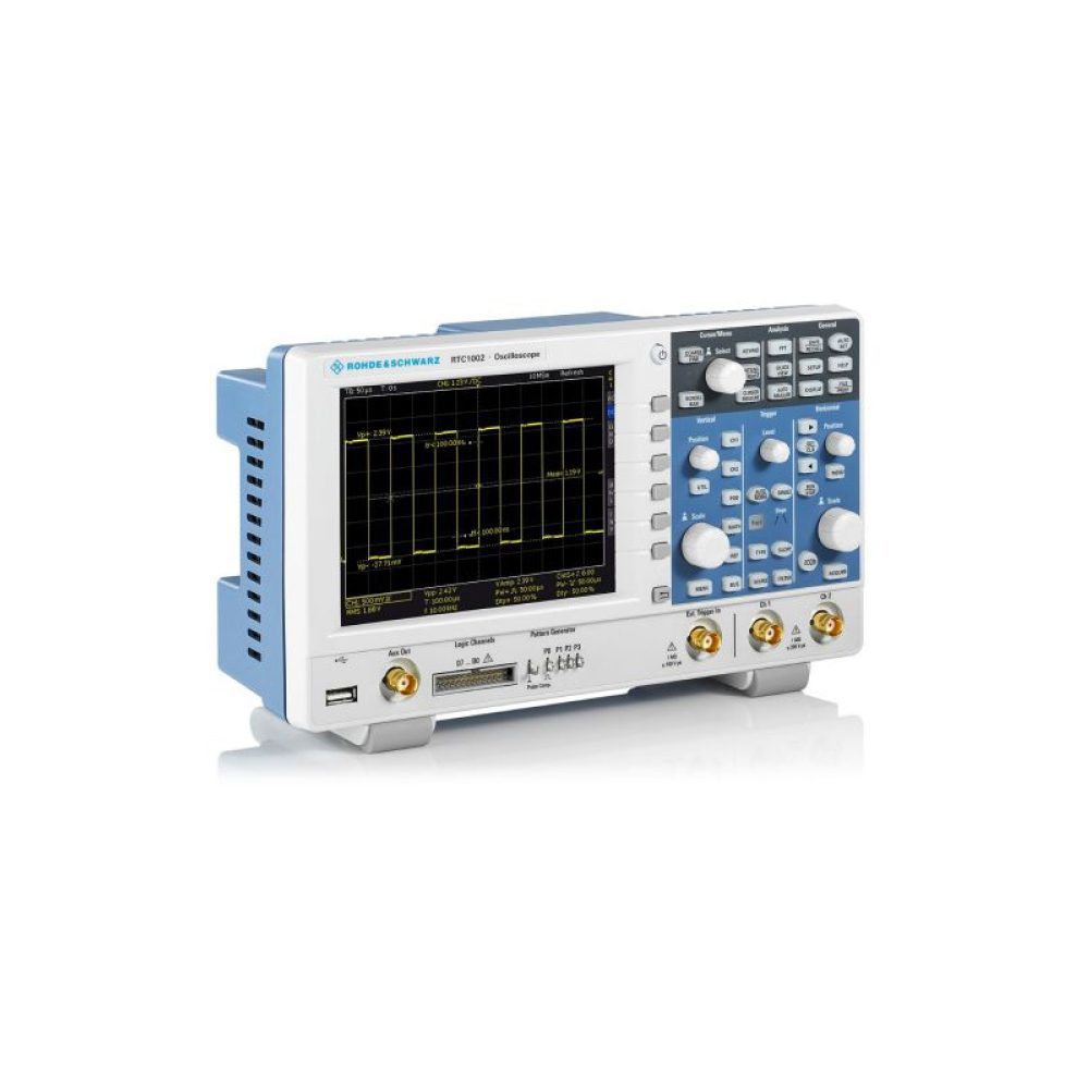 R&S RTB2000 – серия бюджетных 10-битовых многофункциональных осциллографов смешанных сигналов. Приборы серии легки в управлении благодаря широкоформатному сенсорному экрану (диагональ 10,1 дюймов!) и поддержке управления жестами; имеют разрешение 1280х800 пикселей и 12 делений по горизонтали, что дает более подробную информацию о сигнале.