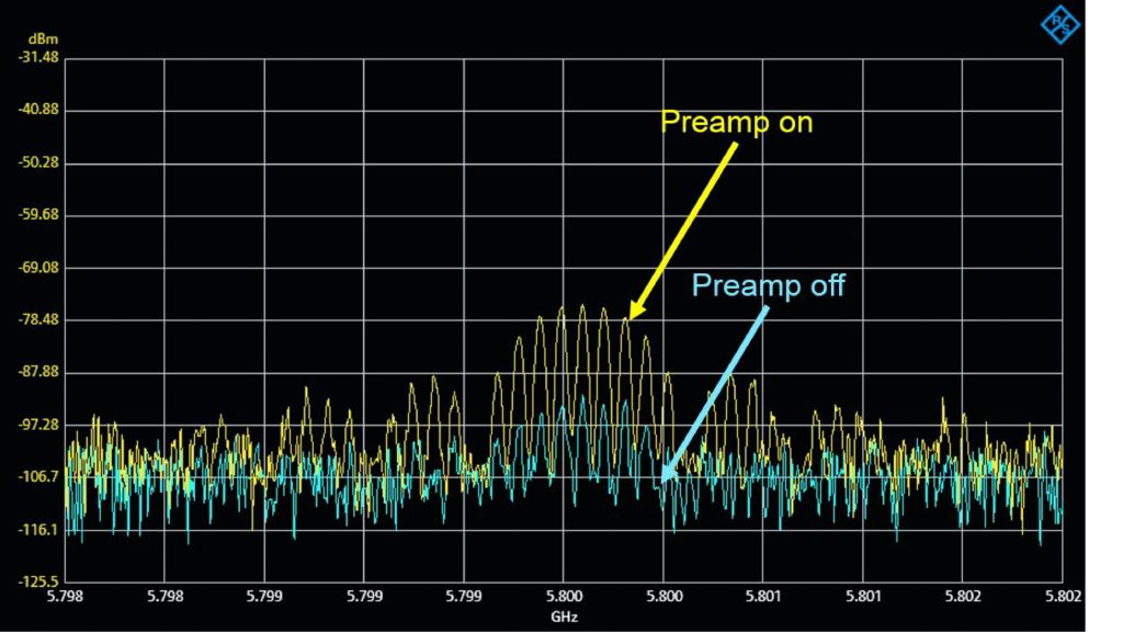 R&S Spectrum Rider имеет DANL такого низкого уровня, как –146 дБмВт (тип.). Низкий уровень DANL предполагает возможность захвата слабых сигналов анализатором. Включите предусилитель (опцию) для дополнительного повышения чувствительности до –162 дБмВт (от 20 МГц до 3 ГГц). Опции предусилителя: