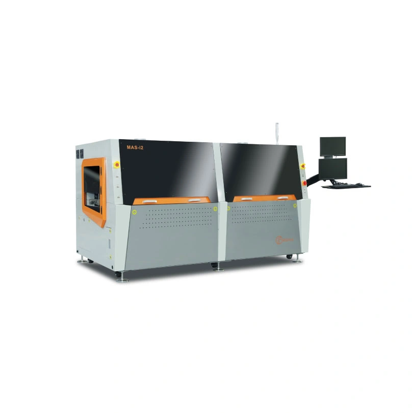 Линейная система селективной пайки с двойным модулем флюсования и двумя независимыми модулями пайки. Система оборудована 3-х секционным конвейером, что позволяет одновременно выполнять обработку 3-х плат (флюсование, предварительный нагрев и пайка).