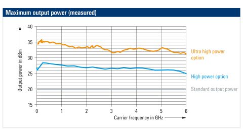 Генератор R&S SMBV100B, оснащенный соответствующими опциями, может генерировать выходную мощность до +34 дБмВт (измеряемую на частоте 1 ГГц), и указанный уровень повышается до +25 дБмВт почти во всем диапазоне частот.