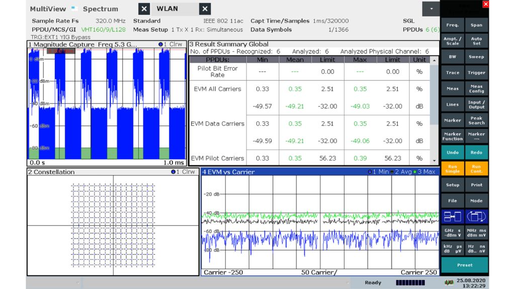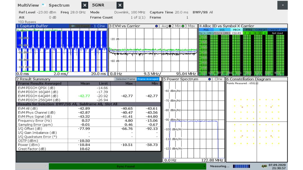 Генератор R&S SMM100A обеспечивает впечатляющее значение модуля вектора ошибок (EVM) менее -42 дБ (0,8%) на ВЧ-частоте 28 ГГц для сигнала 5G NR частотой 100 МГц в соответствии с моделью 3.1 испытаний 3GPP.