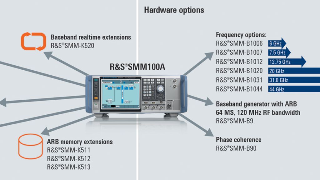 Кроме того, возможно использование генератора R&S SMM100A с различными частотными опциями с максимальной частотой 44 ГГц. Пользователи могут точно настраивать R&S SMM100A в соответствии с конкретными требованиями.