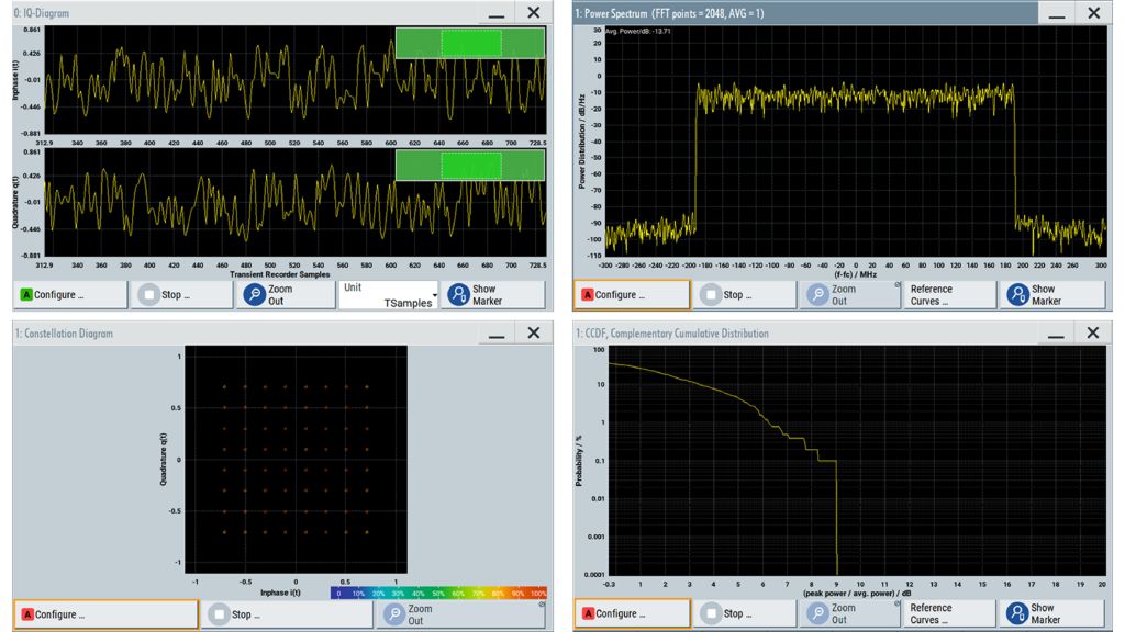 Внутренний генератор модулирующих сигналов в R&S SMM100A поддерживает максимальную полосу ВЧ-модуляции шириной 1 ГГц. Широкополосные сигналы с цифровой модуляцией генерируются в соответствии с требованиями распространенных стандартов беспроводной связи. Генератор R&S SMM100A полностью соответствует будущим требованиям к полосе модуляции.