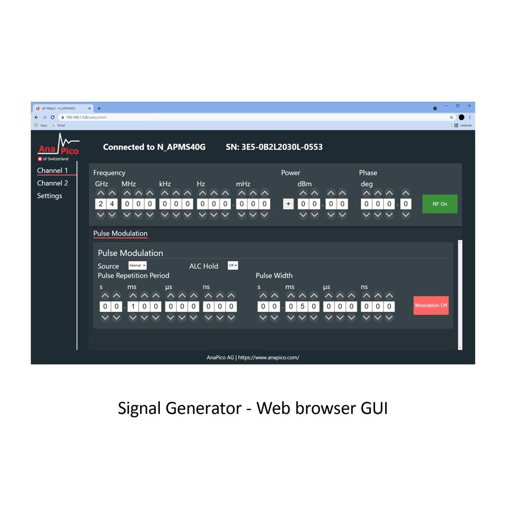 Графический интерфейс пользователя (GUI) на базе ПК предоставляется для управления устройством и предоставляет простой в использовании интерфейс для загрузки файлов предварительно рассчитанных данных IQ. Графический интерфейс пользователя поддерживает различные форматы файлов, включая собственный формат файлов данных IQ.