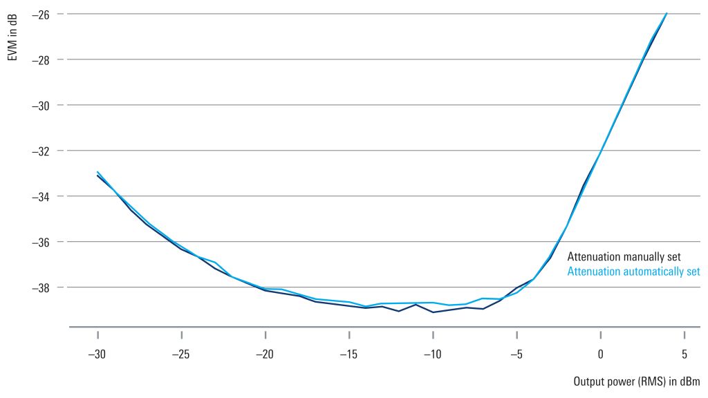 Генерирование широкополосных модулированных сигналов с превосходным качеством модуляции играет решающую роль при разработке нового поколения сетей мобильной связи и автомобильных радаров. R&S FE170ST имеет превосходное качество модуляции. Сигнал 5G NR с полосой канала 2 ГГц (960 кГц SCS) и модуляцией QPSK можно анализировать с модулем вектора ошибок лучше -36 дБ (при 144 ГГц). Это отличное качество модуляции поддерживается в широком динамическом диапазоне.